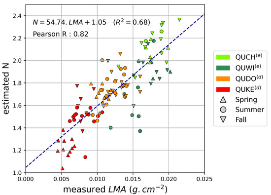 Secondly, EWT is underestimated for some samples. These latter samples originate from QUKE(d) oaks, almost exclusively from spring 2014 collections. Inaccurate estimations for QUKE(d) in spring can have multiple sources of origin. (i) Most of the samples that exhibit an underestimation of EWT were collected at the BLOF site in the 2014 spring campaign. Measurements from this campaign could have been biased. (ii) QUKE(d) leaves are larger compared to those of the other species, which may have led to a poor representativeness of LOPs when considering the whole leaf area. Lastly, (iii) these samples also exhibited low N values (Figure 12). This range of values for N has not been fully studied, and in this range, N has more impact in NIR and SWIR (Figure 4) where EWT is spectrally sensitive.