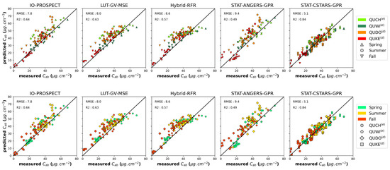 Considering the transferability of statistical methods, similar trends are observed for all leaf traits when comparing STAT-ANGERS to STAT-CSTARS. The lowest RMSE obtained with STAT-ANGERS methods is around twice the value obtained by STAT-CSTARS-GPR for Cab, Cxc, and EWT. For LMA, the difference is less important: the RMSE obtained with STAT-ANGERS-Ridge is around 1.3 times the size of the RMSE obtained with STAT-CSTARS-Ridge. The same trend is observed in the work of Wang et al. [30]. They evaluated the transferability of a PLSR statistical method to retrieve foliar traits across two datasets collected in a tropical and subtropical forest in China and a temperate and subtropical forest in the United States. Wang et al. demonstrated that their PLSR-based method yielded a lower accuracy when applied to an independent dataset, unused in training data. Similarly to our results, they found that a lower relative RMSE difference was reached for LMA (around 35%).
