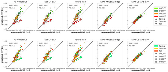 However, both issues (multiplicative bias and underestimation for QUKE(d) spring samples with low N) are not observed in estimates from statistics-based methods, including STAT-ANGERS methods (see Figure 12). This may also indicate that these estimation issues come from inaccurate modeling of PROSPECT for oak EWT and suggest that PROSPECT is not fully suited for our dataset.