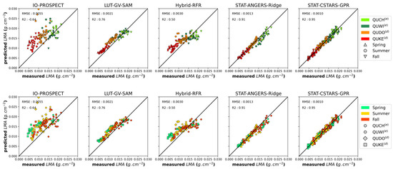 Generally, our estimation results showed global overestimations of LMA using PROSPECT-based methods (bias over 0.0014 g·cm−2) while statistical methods showed lower bias. Gara et al. [32] found underestimations regardless of the season. They found no particular seasonal trend in their dataset (spring/summer/fall: R2 = 0.67/0.82/0.78, RMSE = 0.0014/0.0013/0.0014 g·cm−2; global: R2 = 0.76, RMSE = 0.0014 g·cm−2). More particularly for evergreen oaks, Gonzáles-Cascón et al. [38] estimated the LMA of Quercus Ilex leaves with high performance (R2 = 0.90) by using a PLSR statistical method. For comparison, for QUCH and QUWI, we obtained a mean R2 of 0.62 and RMSE of 0.0012 g·cm−2 with STAT-CSTARS-GPR.