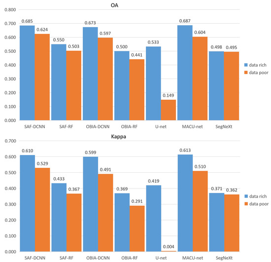 The results of OA, Kappa, and mIoU coefficients for all experiments in this paper are shown in Figure 9.
