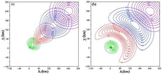 Using G0(ri, rj)C(βi, βj) with the reformulated r and ΦR, the background error correlation functions are constructed for the radial-component velocity, denoted by vr, by setting Rc = 150 km, l = 0.2, a = 2, b = 0.2, and Φ0 = 2 (in arc), and for the tangential-component velocity, denoted by vt, by setting Rc = 150 km, l = 0.1, a = 4, b = 2, and Φ0 = 1.5. The correlation function constructed by G0(ri, rj)C(βi, βj) for vr (or vt) is plotted in Figure 1a (or Figure 1b) as functions of one correlated point (xi, yi) in the original physical space using contours of four different colors corresponding to the four different locations where the other correlated point (xj, yj) is fixed at four different radial distances along the diagonal line northeastward away from the vortex center.