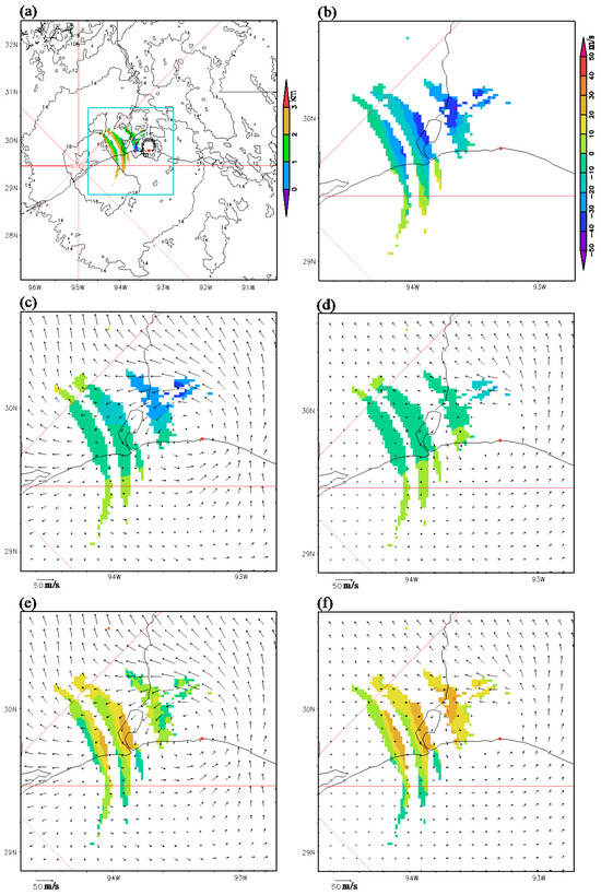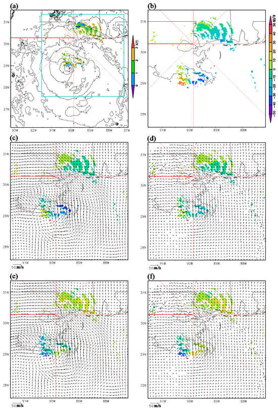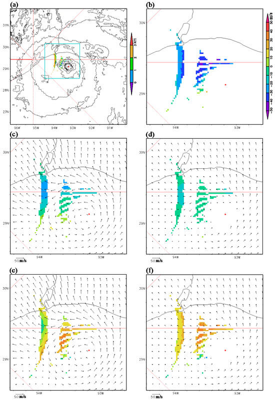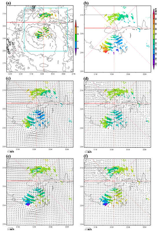 As in Figure 3 but for Hurricane Ida around 16:00 UTC on 29 August 2021 with available radial-velocity observations (within 3 km below the cloud top) from the operational KLIX radar.