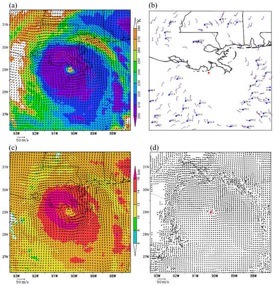 The new method was next applied to three consecutive band-13 brightness temperature images (for Tbob < 280 °K) scanned at 15:59, 16:00, and 16:01 UTC on 26 August 2021 from GOES-16, capturing Hurricane Ida shortly before its landfall in Port Fourchon, Louisiana. The vortex wind retrieval was still performed in a 600 × 600 km2 moving domain co-centered with the hurricane. The hurricane center moving velocity was (uc, vc) = (−3.29, 3.49) m/s. With this moving velocity added to the retrieved domain-relative vortex winds, the resulting ground-relative vortex winds were as plotted using black arrows in Figure 6a atop the brightness temperature image (for Tbob < 280 °K at 16:00 UTC) and replotted in Figure 6c but atop the color shades of the cloud top height. Again, these retrieved vortex winds are not only much denser than the operationally produced AMVs from GOES-16 IR image movements shown in Figure 6b but also more rotational and better organized around the eyewall than the optical-flow technique derived super-high-resolution AMVs shown in Figure 6d. It is worth noting that the optical-flow technique derived super-high-resolution AMVs in Figure 6d became very noisy and contained some unrealistically large values in the periphery of the hurricane vortex where the cloud top height drops below 12 km (see the color shades in Figure 6c).