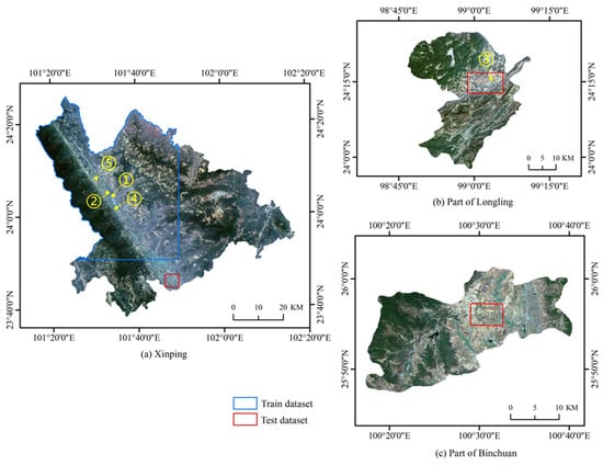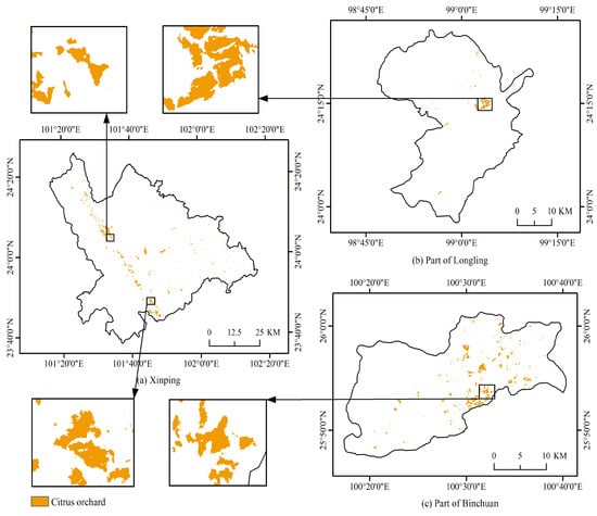 The main area for collecting training samples is located in Xinping County, Yuxi City, Yunnan Province, China. The areas for acquiring test samples are situated in Binchuan and Longling counties in Yunnan Province, China. Xinping is located in the southwestern part of central Yunnan Province, belonging to the temperate climate zone. The terrain is mainly mountainous, with the altitude ranging from 422 m to 3165.9 m. Influenced by the altitude, three types of climates are formed in the area: the high-temperature zone in the river valley, the warm-temperature zone in the mid-mountains, and the low-temperature zone in the high mountains. Xinping has an annual precipitation of 869 mm, and the rainy season is concentrated from April to October, with a total of 2838.7 h of sunshine. Longling County is situated along the valley of the Nu River, and Binchuan County is located in the valley of the south bank of the Jinsha River. The study area has good conditions, such as sufficient light, abundant precipitation, an obvious three-dimensional climate, and typical mountainous agricultural characteristics, for citrus cultivation.