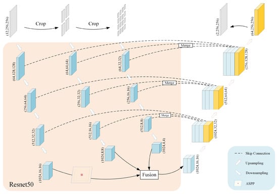 The UNet model has relatively high accuracy with a small sample size, and it has skip connections that combine deep and shallow features []. During feature extraction, simple image attributes, such as color, borders, and other elements, are captured by the shallow structure. Deep structures with a large valid receptive field (VRF) and added convolutional operations are able to capture deep semantic information within the image. This study makes improvement on the basis of the UNet model using the pretrained three-layer Residual Networks 50 (ResNet50) on the ImageNet dataset as the encoder. The proposed architecture is depicted in Figure 2.