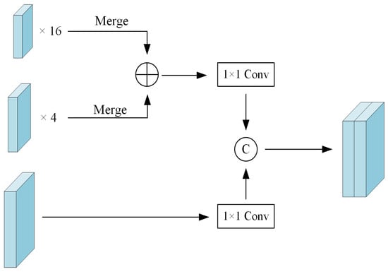 Inspired by the image pyramid and the multiscale training architecture of Ding et al. [], two segmentation branches are designed in the second part of the model to obtain detailed information from the cropped image blocks for supplementation. This module is only suitable for learning the texture and spectral information of small image blocks. ASPP is not added to lower the training cost. First, the image blocks are segmented into 128 × 128 and 64 × 64 sizes and fed into two encoders separately. Then, to integrate the features, this study designs a feature fusion module after the encoders, as depicted in Figure 3. The general idea of the feature fusion module is to supplement the loss of detail in the trunk parts with information from the branches. To facilitate data transmission, these branch feature graphs are recovered to their original 256 × 256 size, and then combined via pixel addition for information enhancement. To avoid an excessive data volume, the outputs of the trunk and branches are downscaled using Conv1 × 1. Finally, the information of the branch and the trunk is integrated via channels concatenation. In addition, the segmentation branch uses the skip connections and restores the image size at the decoder to fuse the multiscale information. The proposed architecture is able to learn features from multiple levels for accurate semantic segmentation.