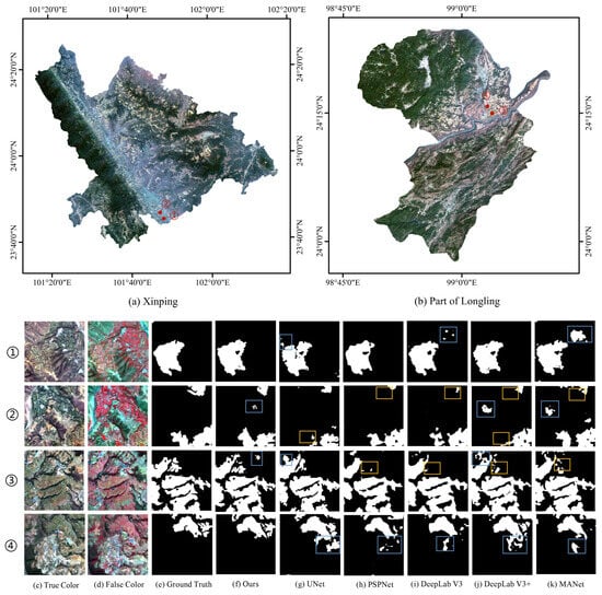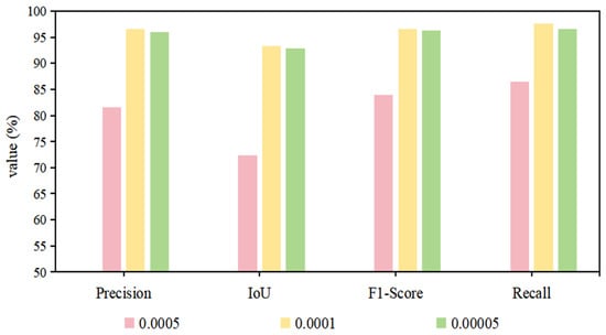 As mentioned in the above section, the training images are split into training and validation data in this study. The test data derived from three different areas are used to precisely assess the different models in practice. The evaluation metrics of precision, recall, F1-score, and intersection over union (IoU) are employed, as shown in Formulas (5)–(8). These assessment metrics are widely utilized in semantic segmentation tasks. The F1-score, which accurately displays the model’s performance on unbalanced datasets, is the harmonic mean of precision and recall [].