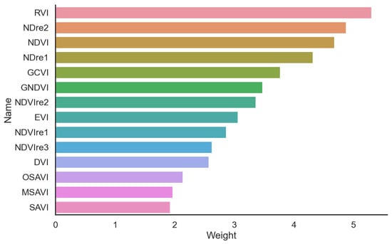 The introduction of excessive indices can lead to model redundancy and affect the results. In this study, the 14 citrus-related vegetation indices mentioned in Section 3.1 are considered, and the highest-scoring vegetation indices are selected to be input into the subsequent neural network. The Relief F algorithm [] is a filtered feature preselection algorithm, meaning that feature selection is performed before training the learner and the feature selection process is independent of the learner. This algorithm makes it easy to obtain the optimal citrus feature space before model training. Relief F is an extension of the Relief algorithm, which works well for multiclassification issues []. The algorithm has high robustness and is appropriate for handling noisy and partial data []. The main types in this study area are forest, farmland, grassland, citrus orchards, and bare land. A test sample R is randomly selected from the sample set, and k nearest neighbors of sample R are searched. From the remaining four groups of samples of the different types, k nearest neighbor samples of the different types are taken. The weight of each feature is determined by comparing the distances between sample features of the same and different types. A feature F whose weight increases when the distance of different category samples is larger than the distance of the same category samples, indicating that the feature is meaningful for classification, is considered. After T iterations, the average weight of each feature is obtained as the final weight []. The weights are calculated as follows: