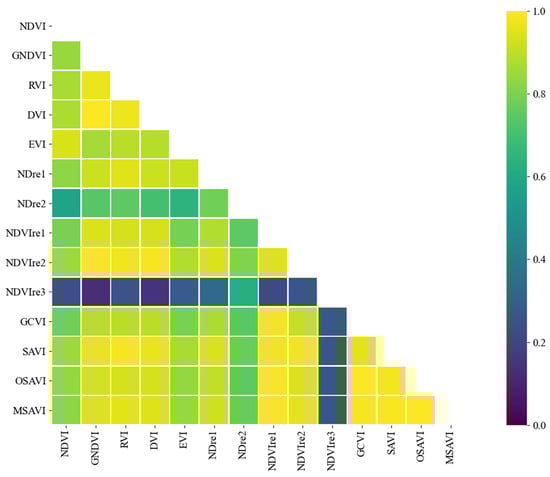 Additionally, the correlation between these 14 vegetation indices is evaluated using the Pearson correlation coefficient []. The correlation coefficients are calculated as follows: