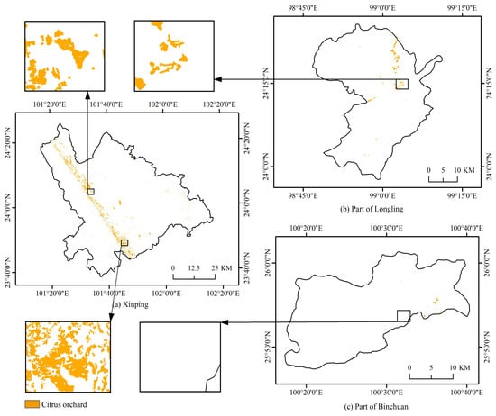 However, the results in the Binchuan test area are fragmented, which can be attributed to two possible reasons. First, the differences in the images acquired at different times affects the results. Second, the citrus orchards in Binchuan are located in the suburbs, and the images are influenced by the local climate and soil conditions []. The planting structure is related to the neighboring crops of the local citrus orchards, which is different from Xinping areas. As shown by the results in [], the context information for each domain is variable and unique. Therefore, the model can be fine-tuned with data to have better transferability. The inclusion of multi-source data in the future is also expected to uncover correlation features between different regions.