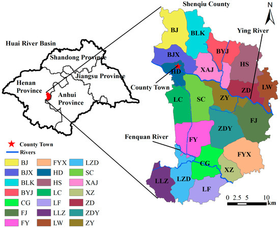 The study area of Shenqiu County, which is located in Huai River Basin, China. This county includes Baiji (BJ), Beijiaoxiang (BJX), Bianlukou (BLK), Beiyangji (BYJ), Chengguan (CG), Fujing (FJ), Fanying (FY), Fengyingxiang (FYX), Huaidian (HD), Hongshan (HS), Lianchi (LC), Liufu (LF), Lilaozhuang (LLZ), Liuwan (LW), Liuzhuangdian (LZD), Shicao (SC), Xinanji (XAJ), Xinzhuang (XZ), Zhidian (ZD), Zhaodeying (ZDY), and Zhouying (ZY) towns.