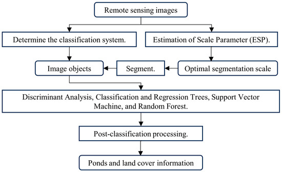 The pond information extraction process outlined in this paper comprises four primary steps (Figure 2). Initially, it involves the identification of land cover categories within the study area. Subsequently, a segmentation process is employed to obtain the image objects. Following this, a machine learning classification approach is employed. Lastly, the acquired pond information undergoes further post-processing for refinement and analysis.