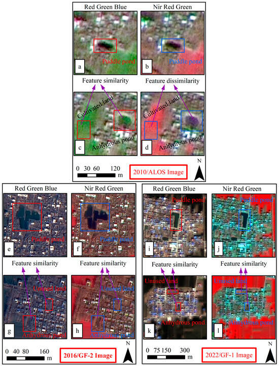 For the pond classification of 2010 images, the ponds were categorized into two distinct types: puddle pond and anhydrous pond. Anhydrous ponds are seasonal and may dry in February, during which there is no rain. The water spectral characteristics of puddle ponds were readily discernible (Figure 3a,b,e,f,i,j). In contrast, the spectral characteristics of water in anhydrous ponds are less pronounced, and these ponds were susceptible to interference from other surface types exhibiting similar spectral characteristics (Figure 3c,d,g,h,k,l).