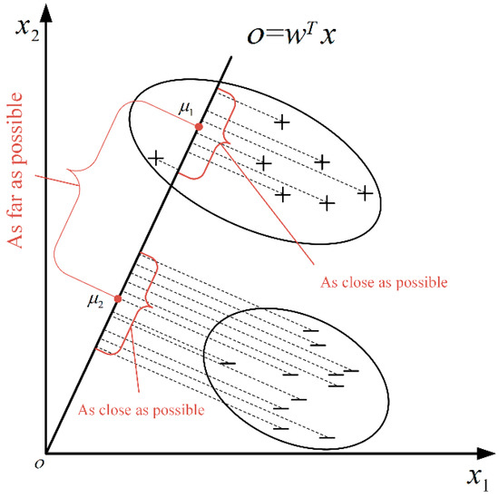 Two-dimensional schematic diagram of LDA. (“+”, “−” respectively represent two types of sample data, namely ; ellipse represents the outer contour of the data cluster, dotted lines represent the projection, and and represent the center points of the two types of sample data after projection; the vector is the projected straight line, that is the discriminant function, and the projection of on the straight line is ).