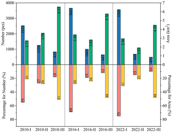 Ponds of different sizes have distinct functions and water storage capacities. We classified ponds of this study area into three levels: I (<2000 m2), II (≥2000–4000 m2), III (≥4000 m2) (Figure 6 and Figure 7). In terms of the number of ponds, level-I ponds constituted over 50% in all three periods. However, their corresponding area proportion ranged from 21% to 31%. Notably, there was an increase in 1132 ponds (total of 0.67 km2) from 2010 to 2016 and a decrease in 94 ponds (0.45 km2) from 2016 to 2022. For level-II ponds, their number proportion ranged from 15% to 27% across the three periods, with the corresponding area proportion from 21% to 28%. There was loss of 254 ponds (0.76 km2) from 2010 to 2016 and 317 ponds (0.90 km2) from 2016 to 2022. The level-III ponds have a different situation from level-I ponds. Their number proportion was consistently the smallest among the three levels, ranging from 10% to 18%. However, they accounted for the largest area proportion, constituting approximately 50% of the total pond area. The number of the level-III ponds was reduced by 188 (0.79 km2) from 2010 to 2016, and by 156 (1.27 km2) from 2016 to 2022. In summary, the overall characteristics of the ponds in this county were the presence of numerous small area ponds with a relatively modest total area and a limited number of larger ponds contributing significantly to the total area.