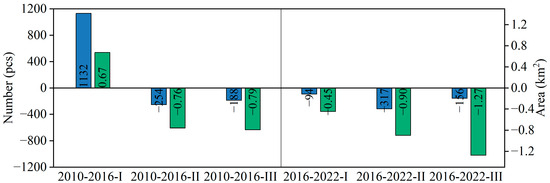 The changes of ponds in different area levels from 2010 to 2016 and 2016 to 2022 (area unit: km2; number unit: pcs).