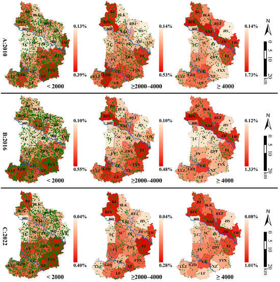 The spatial distribution of ponds (represented by the green dots) in the three levels (I < 2000 m2, II ≥ 2000–4000 m2, III ≥ 4000 m2), and the area percentage of ponds in each town’s area in 2010, 2016, and 2022.