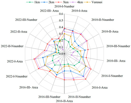 The spatial autocorrelation, measured by Moran’s I index at the 1–4 km grid scales and the Voronoi diagram, for both the number and area of ponds ranged from 0.1 to 0.5 and exhibited statistical significance (p-value < 0.1, Z-score > 2.58) (Figure 9). The Voronoi diagram was generated using GIS software, which employed village points as input in its computation. The results indicated that the pond distribution had a discernible spatial autocorrelation, showing a clustering distribution. Except for 2010-I-Area, 2010-II-Number, and 2022-III-Area, Moran’s I values for both pond number and area were consistently higher at the 3 km grid scale. Consequently, the 3 km grid was identified as the most suitable unit of autocorrelation analysis.