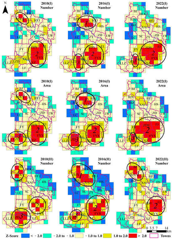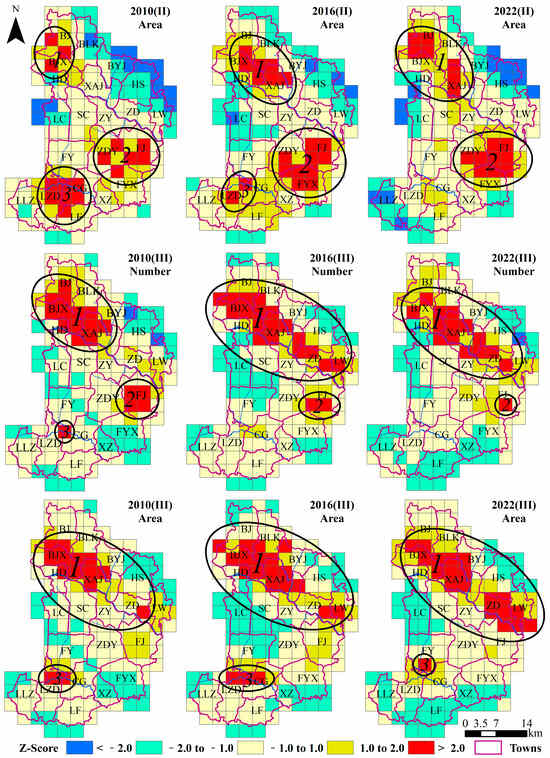 The hot spot analysis results at the 3 km grid scale (Figure 10) displayed that all three levels of ponds presented pronounced spatial aggregation characteristics, and the high-value hot spot grids (Z-score > 2) were concentrated in three distinct clustered areas. The first cluster area was predominantly located to the north of the Ying River, that is the north or northwest of the county. The second cluster area was primarily located in the southeast region of the county. The third cluster area was mostly situated in the south, and the Fenquan River flows through this area. The level-III ponds were most widely distributed in the first area, whereas the second and third areas were primarily dominated by level-I and level-II ponds. From 2010 to 2022, except for the first cluster area of level-I ponds, the third cluster area of level-II ponds, and the third cluster area of the number of level-III ponds had vanished, the cluster areas of other ponds had been always in existence.