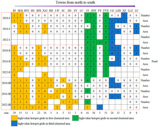 To identify towns with high-value hotspot grids, we counted the number of such grids within each town based on the center coordinates of each grid (Figure 11). FYX, FJ, ZDY, XAJ, BJ, CG, and BJX have a large number of high-value hotspot grids, with a total of 51, 41, 36, 34, 29, 24, and 22 grids, respectively. Conversely, other towns recorded fewer than 20 high-value hotspot grids each. It is noteworthy that towns situated in the northern region exhibited a significant concentration of high-value hotspot grids on level-III ponds, while those in the southern region are concentrated on level-I and level-II ponds.