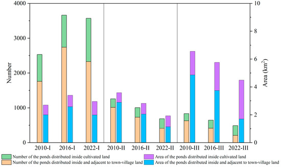 We have identified another salient characteristic in the spatial distribution of ponds, namely their strong association with town-village land (i.e., townland and rural settlements) and cultivated land. Town-village land and cultivated land hold significance in the lives of residents and agricultural production. Thereby, rendering the quantity and extent of ponds of paramount importance. Figure 12 shows the pond number and area situated within and adjacent to town-village land and within cultivated land. It can be found that the pond number and area within and adjacent to town-village land far exceeded those situated within cultivated land. From 2010 to 2016, there was an increase in both the number and area of level-I ponds within cultivated land, as well as those within and adjacent to town-village land. However, the latter experienced a notably more substantial increment compared to the former. In contrast, between 2016 and 2022, we observed a decrease in the number and area of level-I ponds within and adjacent to town-village land, while those within cultivated land witnessed an increase. From 2010 to 2022, there was a small increase in the number and area of level II and III ponds situated within cultivated land. In the same period, however, there was a considerable reduction in both the number and area of ponds located within and adjacent to town-village land.
