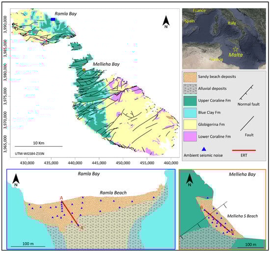 Geological map of the Maltese archipelago. The top right inset shows its position in the Mediterranean Sea. The study areas (Ramla Beach and Mellieha S Beach) are shown in the bottom images with the geophysical measurements presented in this work.