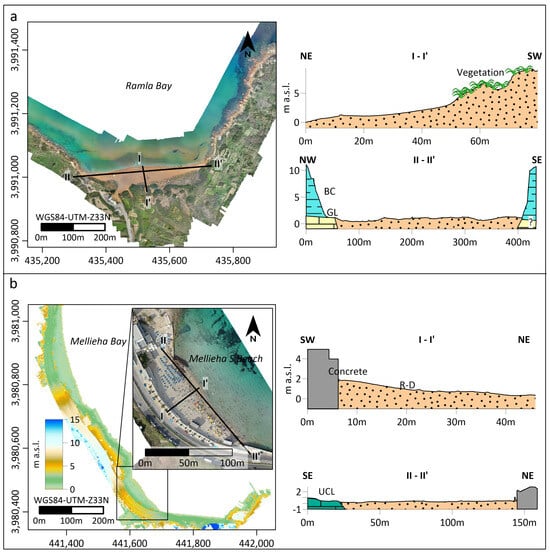 Surface characterization. (a) Orthomosaic of Ramla Bay and position of profiles presented on the right: I-I’ orthogonal to the coastline, II-II’ parallel to the coastline. (b) DTM of Mellieha Bay and ortho-mosaic of Mellieha S Beach showing the position of the profiles presented: I-I’, orthogonal to the coastline and II-II’, parallel to the coastline. Main surface geological features are labelled and characterized: R-D: recent deposits (mainly sand); UCL: Upper Coralline Limestone Fm; BC: Blue Clay Fm; GL: Globigerina Limestone Fm.
