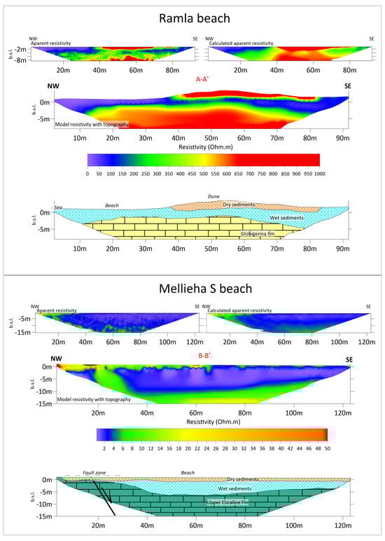 To assess the quality of electrode–substrate coupling, impedance measurements were performed for each profile. High impedance values (>3000 Ohm) were found for some electrodes in very-dry sandy areas. To improve the electrode–soil contact, the soil on such electrodes was moistened with a saline water solution. To ensure accurate positioning of the electrodes, GNSS equipment was employed. Topographic information was incorporated into the ERT data to calculate apparent resistivity. To convert the pseudo section of apparent resistivity derived from the field data into a 2D model of real resistivity, we employed the Res2DInv software v. 4.08. We employed a robust inversion that usually best resolves sharp conductivity boundaries [,,]. The absolute error at Ramla beach after 5 iterations was 21.5%, and the absolute error at Mellieha beach after 4 iterations was 17.3%. Despite these relatively high errors, the models developed demonstrated a robust correspondence with the local geology. In complex geological environments, electrical images tend to experience errors over 15% and, in many cases, reducing these errors without introducing artefacts is not possible [,].