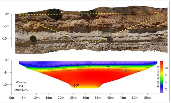 At depths close to 4 m b.s.l. and extending to the bottom of the profile, a third domain of resistivities begins on a sub horizontal horizon. This domain exhibits relatively high values that gradually increase with depth, ranging between 500 and 1000 Ohm·m. This domain was interpreted as the limestones of the GL Fm, the rock underlying the sedimentary deposits of the beach. It is worth noting that its surface exhibits a slope towards the sea, likely associated with the marine platform, and a counter-slope inland, probably linked to the archaeological site present in the area [,].