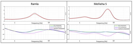 Left: Ramla Beach HVSR example. HVSR peak is present at 3.8 Hz and corresponds with an “eye shape” geometry in the component spectra, where the vertical component presents a fall. Mellieha S Beach HVSR example: Two peaks are present, at 1.5 Hz (F0) and 6.8 Hz (F1). Both peaks correspond with “eye shape” geometry in the component spectra.
