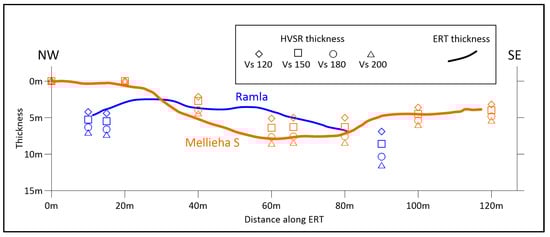 At Mellieha S Beach, an average Vs of 180 m/s shows a good fit with the resistivity calculated sedimentary deposits. At Ramla, despite the limited number of HVSR stations, an average Vs of 120 m/s seems to be a reasonable value to avoid overestimation of sediment thickness. The selection of those Vs values are in agreement with previous works and typical Vs on sediments [,].