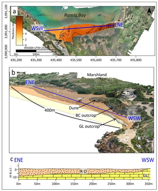 In Ramla Bay, natural geomorphological features were found to be better preserved due to lower anthropogenic influence. The beach at this site is partially enclosed towards the valley and is limited by a system of fixed dunes covered with vegetation. Small marshy areas develop among these dunes, creating a marshland environment, and some agricultural activity is observed in the area. Steep rocky formations limit the sides of the beach. Towards the western boundary, the beach is delimited by the outcrop of the BC Fm, and at its bottom the transitional contact with the GL Fm has a slight sub horizontal dip to the northeast. GL Fm., with greyish tones in this sector, acts as the bedrock for the beach sediments. As for the eastern boundary of the beach, it is composed of slope deposits and outcrops of the BC Fm. The stratigraphic boundary with the GL Fm is not exposed, presumably due to burial by beach sediments (Figure 3a). The area of sand accumulation was determined to be 14,062 m2, with 18,344 m3 of sand above sea level.