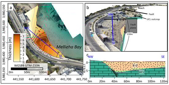 Our interpretation, based both on the ERT and HVSR results, suggests that the geometry of Mellieha S Beach deposits is controlled by structural factors, particularly by the presence of a normal fault (Figure 9b,c). This fault dips to the SW, and the hanging wall block consists of UCL, gently dipping in the opposite direction to the fault.