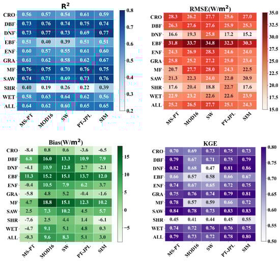 Overall, all five processed-based ET algorithms provided reasonable ET estimations for all land cover types, with KGE ranging from 0.72 to 0.80, R2 varying from 0.60 to 0.65 (p < 0.01), bias varying from −0.3 W/m2 to 9.6 W/m2 and RMSE varying from 24.3 W/m2 to 27.1 W/m2 (Figure 3). In terms of performance, the SIM ET algorithm outperforms the PT-JPL, MS-PT, MOD16, and SW ET algorithms, exhibiting the highest KGE and R2 values and the lowest RMSE. Compared with the worst-performing SW algorithm, the SIM reduces the RMSE by 3.4 W/m2 and increases the KGE by approximately 0.8 and R2 by 0.5. In general, the resistance-based ET algorithms (SW and MOD16) have large biases due to complex physical mechanisms and accumulated errors due to excessive numbers of input variables. In contrast, the PT-based ET algorithms (MS-PT and PT-JPL) exhibit higher accuracies in their ET estimations than the SW and RS-PM products, which is due to their partitioning of the total ET and the smaller errors present in the required inputs []. Due to the calibration of the SIM ET product using EC ground observations at 15 flux tower sites spanning various land cover types worldwide, it outperforms the other four ET algorithms in terms of ET estimations.