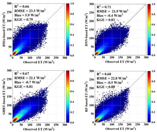 Considering that none of the VIIRS-derived ET algorithms (DNN) can provide an ET estimation across all land cover types that is consistently the best, we used the DNN, RF, GBRT and BMA algorithms to improve the ET estimations by integrating five ET algorithms. Figure 4 shows the performances of the DNN, RF, GBRT and BMA integration algorithms when using the 10-fold cross-validation method for all 278 flux tower sites among all sites. The integration algorithms provide reliable ET estimations, with R2 values ranging from 0.66 to 0.71 (p < 0.01), RMSE values ranging from 21.9 W/m2 to 23.3 W/m2 and KGE values ranging from 0.79 to 0.83. The best performance for ET estimation is provided by the DNN algorithm with the highest R2 (0.71) and KGE (0.83) values and the smallest RMSE (21.9 W/m2) value. This is followed by the GBRT, RF and BMA algorithms.