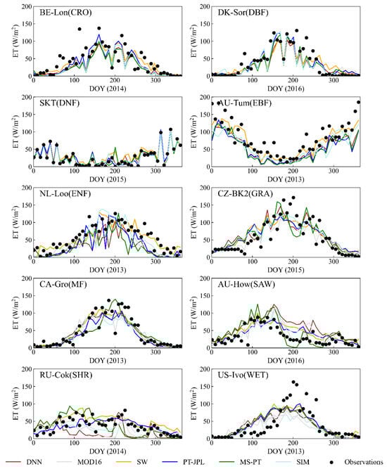 The inaccuracies of data sources are predominantly passed down through in situ measurements, satellite-based observations, and meteorological reanalysis data. Although EC observations are relatively accurate for ET acquisition, biases of approximately 5–25% still exist []. The EC method’s major drawback lies in its energy imbalance and inability to detect large eddies. Although we corrected the energy imbalance using a method developed by Twine et al. (2000) [], the uncertainties in EC observations remain unclear []. Previous studies showed that MERRA2 meteorological data also contain a large bias when compared to in situ measurements, and no single reanalysis dataset is superior to others in terms of meteorological variables in terms of estimating land surface energy budgets [,].