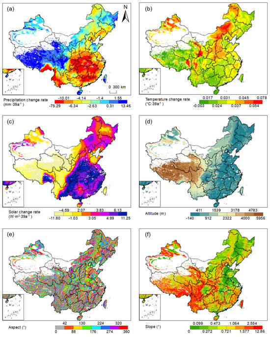 The six environmental factors in China: (a) precipitation change rate, (b) temperature change rate, (c) solar radiation change rate, (d) altitude, (e) aspect, and (f) slope. The white area represents non-vegetation.