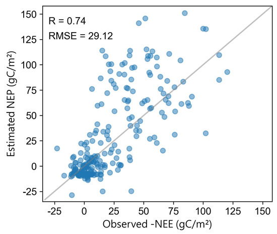 We also validated the estimated NEP results. We approximated the ground actual observed NEP by taking the negative values of Net Ecosystem Exchange (NEE) observed at Fluxnet sites (Figure 4). We compared this approximation with NEP estimated based on remote sensing at corresponding times and locations to assess the accuracy of our NEP estimates. The results indicated a correlation coefficient (R) of 0.74 and a root mean square error (RMSE) of 29.12 gC·m−2. Our findings demonstrate good accuracy in the estimated NEP results.