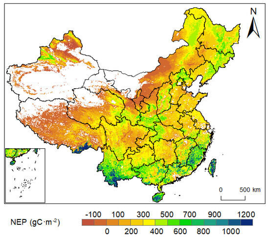 The mean annual NEP value exceeds 400 gC·m−2 in northeastern, southwestern, and southeastern China. Among these regions, high NEP values (>1000 gC·m−2) were observed in the Southeastern Tibetan Plateau, Southern Sichuan, Hainan, Taiwan, and Fujian Province. Most of these areas are characterized by low topography, warm climate, and abundant precipitation, making them highly suitable for vegetation growth. Conversely, most areas in the Tibetan Plateau, Xinjiang, and Inner Mongolia that are controlled by arid or semi-arid climate showed much lower NEP values, generally less than 100 gC·m−2 or even negative.