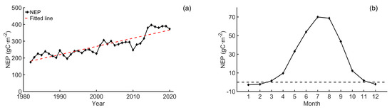 - During 1982–2020, the annual mean NEP of the Chinese vegetation region exhibited a general fluctuating upward trend. In terms of NEP seasonal change, the vegetation area in China was generally a carbon sink from March to November, and a carbon source from December to February. During the 39-year period, a significant proportion of vegetated regions in China showed an upward trend in NEP, and the overall average growth rate in China’s vegetation areas is 4.69 gC·m−2·a−1. This indicates an enhanced carbon sequestration capacity of these vegetated regions.