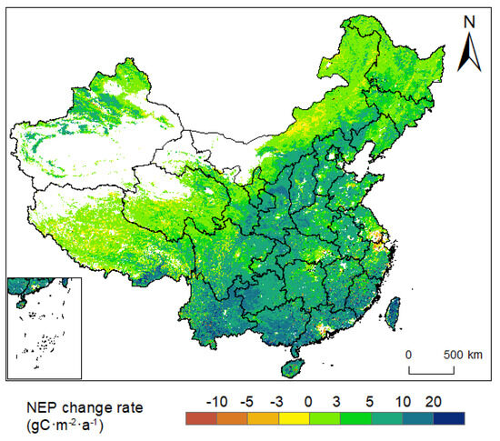 Spatiotemporal patterns of the vegetation NEP change rates in China during 1982–2020. The white area represents vegetation.