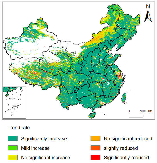Distribution of the significance of the vegetation NEP change rate in China during 1982–2020. The white area represents non-vegetation.