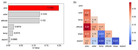 The factor detector in the Geodetector model was used to analyze the impacts of six factors (precipitation change rate, temperature change rate, solar radiation change rate, altitude, aspect, and slope) on the NEP change rate. All six environmental factors influenced the spatial variability of the NEP change rate at a statistically significant level (). Among them, the precipitation change rate had the strongest effect (q-value = 0.198). This was followed by solar radiation change rate (0.124) and altitude (0.122) (Figure 9a), suggesting that these three factors played a significant role in influencing the temporal change of NEP in China. Precipitation directly affects the amount of water available to plants. Moisture is a key limiting factor for plant photosynthesis and growth. Adequate precipitation can increase soil moisture, thereby increasing the rate of photosynthesis and growth of plants. On the other hand, insufficient or excessive precipitation can adversely affect plants. Drought conditions can limit plant photosynthesis, while excessive precipitation may lead to water stress, affecting the availability of oxygen to the roots [45,46]. This is also consistent with previous research [13,47,48,49,50]. Slope, temperature change rate, and aspect had weak effects on NEP change, as evidenced by their lower q-values of 0.021, 0.017, and 0.007, respectively.
