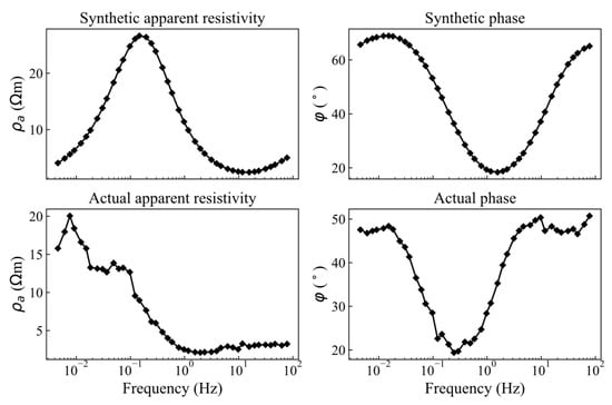 Due to the challenges in collecting high-quality realistic MT measurements and associated resistivity models delineating realistic underground structures, synthetic datasets (composed of synthetic resistivity models and the corresponding simulated apparent resistivity and phase data; the former serve as the target output and the latter act as the input) provide a valuable alternative for network training. One commonly used synthetic resistivity model generation method, also employed in this study, is to generate a series of layered resistivity models characterized by smoothly varying resistivity values. The associated simulated apparent resistivity and phase, similar to the ones shown in Figure 1, vary smoothly with the measurement frequencies. However, realistic MT measurements are usually distorted by various types of noise. Though noise reduction methods can be applied to mitigate the adverse effect of noise, it highly depends on domain knowledge and individual experience, and may lead to over-abatement and inevitably increase time and labor burden. Even after noise reduction operation, more often, the denoised MT measurements still contain residual interference. As a result, as displayed in Figure 1, the derived apparent resistivity and phase exhibit fluctuations and irregularities in curves that noticeably deviate from the synthetic ones. This is one of the primary factors that renders DL inversion methods challenging when inverting actual MT data.