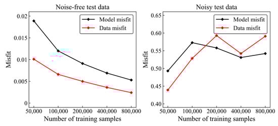 To quantitatively illustrate and analyze the inversion performance of deep learning models trained with noise-free datasets on both noise-free and noisy MT data, we conducted the following set of experiments. The data preparation method described in Section 3.3 was used to generate a noise-free training dataset consisting of 800,000 samples (resistivity model-apparent resistivity and phase pairs; the former serves as the target output and the latter act as the input). Likewise, a noise-free test dataset of 20,000 samples was created, and we also generated a noisy test dataset by injecting 5% uniform random noise into this noise-free test dataset. Subsequently, we trained the proposed physics-informed SwinTUNet (PISwinTUNet) (see Section 3.3) using the constructed training datasets of 50,000, 100,000, 200,000, 400,000 and 800,000 samples, respectively, after which the trained networks were loaded to invert both the noise-free and noisy test datasets. Figure 2 shows the model and data misfit (see definitions in Section 3.3) comparison results of the noise-free and noisy test datasets. Evidently, as the training samples grow in number, the model and data misfits of the noise-free test dataset exhibit a gradual decline trend. Conversely, when it comes to the noisy test dataset, the model and data misfits first increase rapidly and then fluctuate around a high of 0.55. The experimental results demonstrate that the DL inversion methods severely degrade in inversion performance when encountering unfamiliar data that are significantly different from the synthetic data for network training, and an increase in training dataset size does not contribute to the improvement of the inversion performance. Hence, in this work, we propose three strategies and their combinations for adding noise in training data to mitigate the adverse effect of noise interference and promote DL inversion application in realistic MT exploration scenarios.