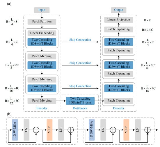 where and represent the output features. Moreover, the Patch Merging layer performs spatial resolution downsampling. The Patch Expanding layer is developed to enable upsampling without convolution or interpolation, and the Linear Projection layer adjusts the network output to match the output in dimension. In the following implementations, parameters , , and are set to 128, 32, 128 and 50, respectively.