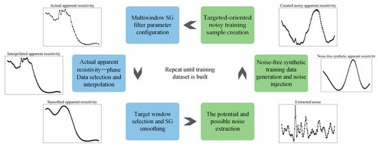 The Savitzky–Golay (SG) filter, initially proposed by Savitzky and Golay [] and renowned for its data smoothing capabilities, has found extensive application in various domains, encompassing geosciences, medicine and analytical chemistry. The SG filter is capable of data smoothing without compromising the retention of valid information. Two pivotal parameters of the SG filter are window size and polynomial order. Typically, optimizing the window size while maintaining a fixed polynomial order is a more appropriate choice. For a given order, a larger window size results in a smoother outcome, albeit at the cost of attenuating sharp fluctuations, whereas a smaller window size permits the SG filter to snugly fit the data but at the expense of sacrificing smoothness. Inspired by this property and characteristic, we propose a multiwindow SG (MWSG) filtering scheme to extract potential and possible noise embedded in the target field data and then introduce them into the training data.