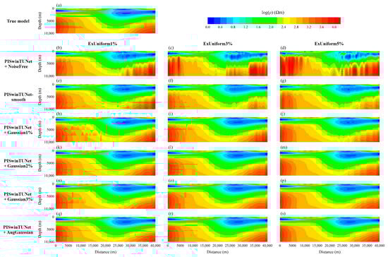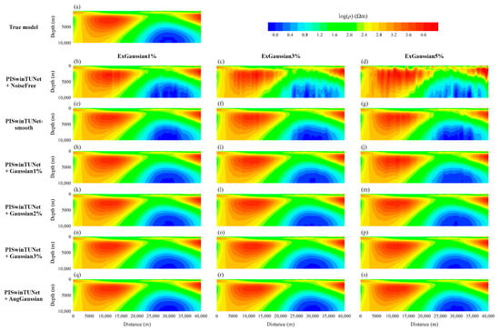 This section is intended to further assess the proposed robust DL inversion method on synthetic MT data contaminated by unfamiliar noise. The synthetic example for inversion test here differs from the training data, not only in noise level but also in distribution. We regenerated a synthetic subsurface resistivity profile (see Figure 7a) and calculated the associated apparent resistivity and phase. Similar to the example in Section 4.1, uniform distribution relative noise rather than Gaussian relative noise at 1%, 3% and 5% levels was introduced into the apparent resistivity and phase data, respectively, forming three noisy MT datasets, ExUniform1%, ExUniform3% and ExUniform5%, for inversion comparison. PISwinTUNets trained on NoiseFree, Gaussian1%, Gaussian2%, Gaussian3% and AugGaussian, together with PISwinTUNet-smooth, were applied to make predictions.