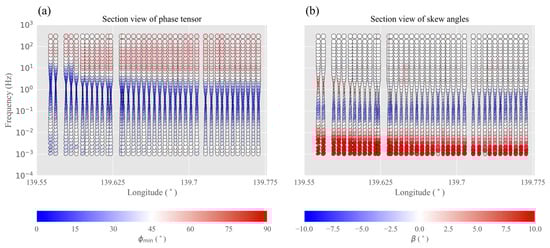 A phase tensor analysis [] was conducted using the open-source library MTpy [] to investigate the underground resistivity structure from the MT field data. Figure 9 displays cross-sectional phase tensor ellipses, normalized using the maximum phase value . The ellipses in Figure 9a,b are color-coded based on the minimum phase tensor value and skew angle , respectively. It is evident that the underground resistivity structure can be characterized into three segments as we delve deeper (corresponding to decreasing frequencies). In the frequency band of 293 to 10 Hz, typically exceeds 45° and mostly remains below 3 in absolute magnitude, reflecting that there exist conductive regions near the Earth’s surface and the corresponding resistivity structure tends to be 1D or 2D. Within the 10 to 0.1 Hz frequency range, is noticeably less than 45°, implying that there are highly resistive zones. For frequencies between 0.1 and 0.001068 Hz, shows slight deviations from 45°, indicating relatively low-resistivity zones at greater depths. The absolute value of in the latter two frequency bands is predominantly larger than 3, indicating a trend toward a 3D resistivity structure. In brief, as depth increases, the underground resistivity structure of the study area can be characterized by a low–high–low resistivity pattern. The shallow zones tend to have a simple resistivity structure, while deeper structures are likely to be more intricate.